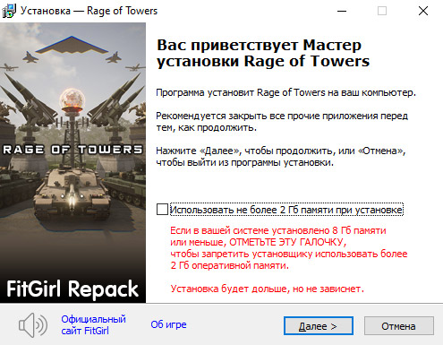 - Репак основан на ISO-образе Rage.Of.Towers-TENOKE: tenoke-rage.of.towers.iso (6,564,960,256 байт)