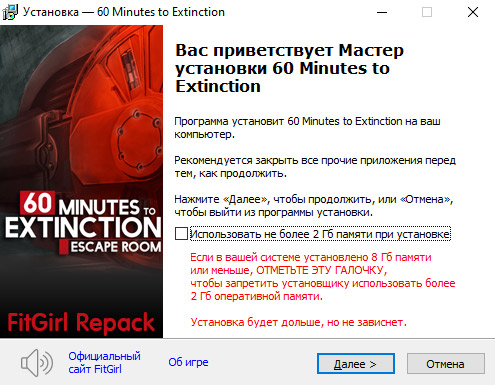 - Репак основан на ISO-образе 60.Minutes.to.Extinction.Escape.Room-TENOKE: tenoke-60.minutes.to.extinction.escape.room.iso (5,555,554,304 байта)