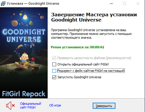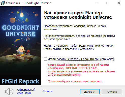 - Репак основан на ISO-образе Goodnight.Universe-TENOKE: tenoke-goodnight.universe.iso (7,833,853,952 байта)