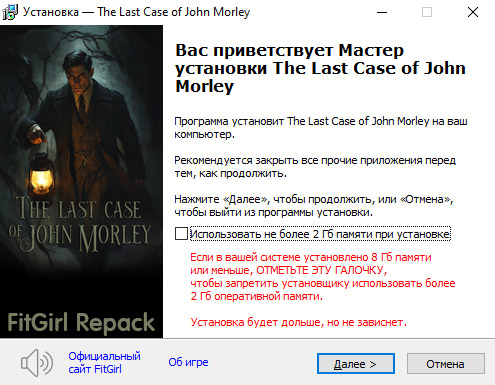 - Репак основан на ISO-образе The.Last.Case.of.John.Morley-TENOKE: tenoke-the.last.case.of.john.morley.iso (6,345,881,600 байт)