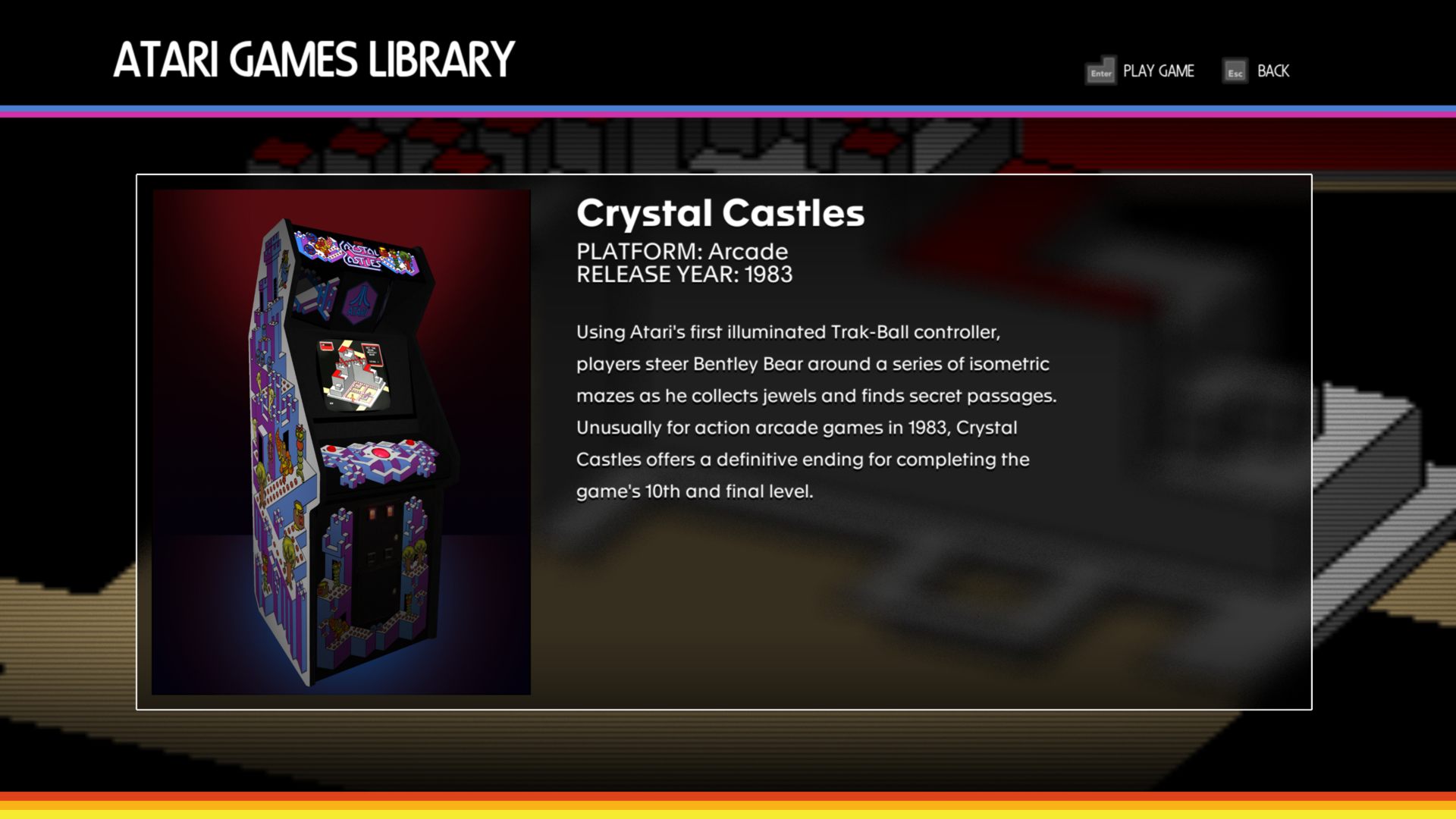 Массивный выбор из более чем 100 игр охватывает семь различных платформ: Arcade, 2600, 5200, 7800, 8-битные компьютеры Atari и, впервые на современных консолях, Atari Lynx и Jaguar! Играйте в классику, такую как Tempest 2000, Asteroids и Yars' Revenge, или погрузитесь в более глубокие игры.