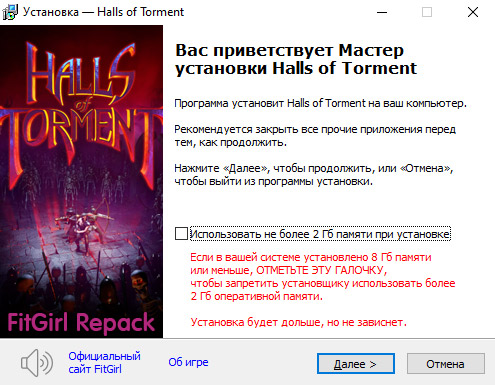 - Для установки репака требуется минимум 2 Гб свободной оперативной памяти (включая виртуальную)