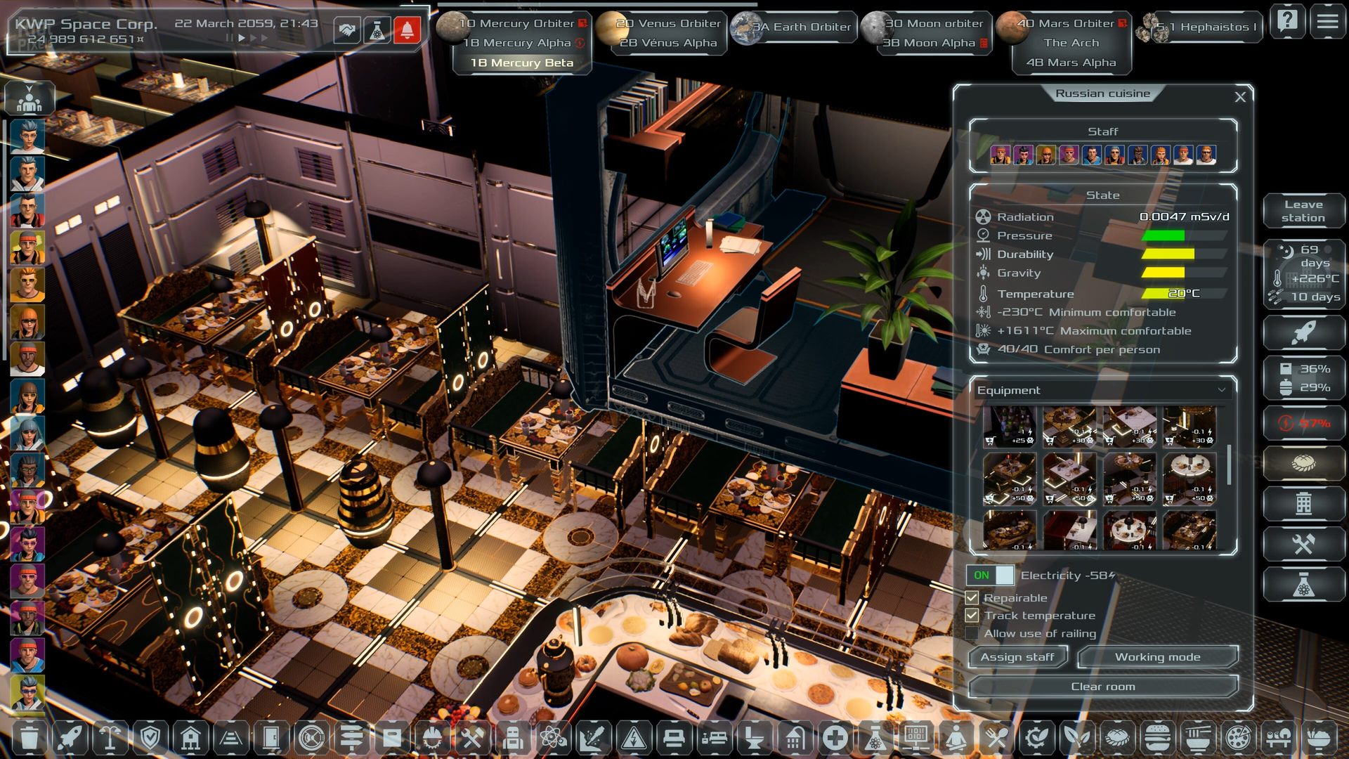 • Персонал - Каждый космонавт - уникальная личность с собственным характером, мировоззрением, профессиональными навыками и опытом. С ростом опыта и квалификации увеличивается потребность в достойной оплате труда и комфортных условиях жизни. Колонисты, как и все люди, нуждаются в удовлетворении базовых потребностей: в еде, сне, отдыхе и личной гигиене. Особое внимание необходимо уделять здоровью поселенцев. Своевременное лечение и забота о травмированных и заболевших обеспечат их выживание и благополучие.