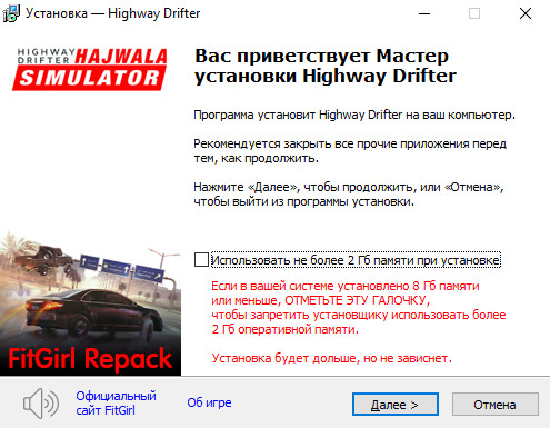 - Репак основан на ISO-образе Highway.Drifter.Hajwala.Simulator-SKIDROW: sr-highwaydrifterhajwalasimulator.iso (4,563,996,672 байта)