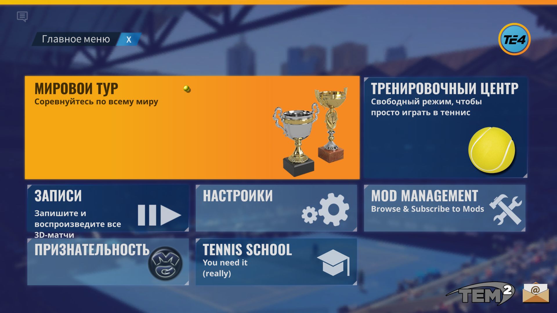 TE4 предлагает один из самых проработанных режимов World Tour в истории теннисных видеоигр. Более 3500 игроков, развивающихся на протяжении нескольких десятилетий, участвуют в свыше 400 турнирах ежегодно - от квалификаций юниорских соревнований низкого уровня до финалов профессиональных турниров высшего класса, как в одиночных, так и в парных разрядах. Всё это позволяет полностью погрузиться в карьеру настоящего профессионального теннисиста.