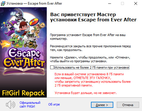• Для установки репака требуется минимум 2 Гб свободной оперативной памяти (включая виртуальную)