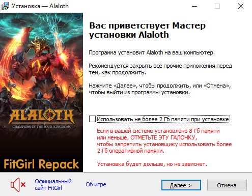 - Репак основан на ISO-образе Alaloth.Champions.of.The.Four.Kingdoms.v1.2-RUNE: rune-alaloth.champions.of.the.four.kingdoms.v1.2.iso (10,122,362,880 байт)