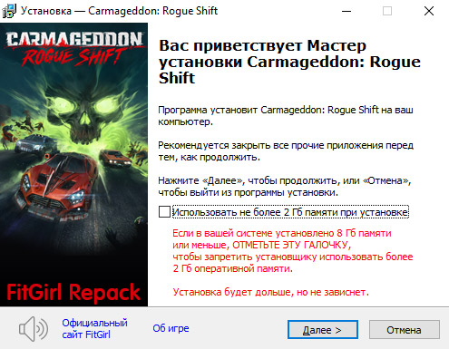- Репак основан на ISO-образе Carmageddon.Rogue.Shift-RUNE: rune-carmageddon.rogue.shift.iso (32,339,099,648 байт)
