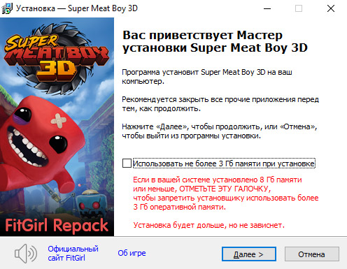 - Репак основан на ISO-образе Super.Meat.Boy.3D-RUNE: rune-super.meat.boy.3d.iso (3,386,507,264 байта)