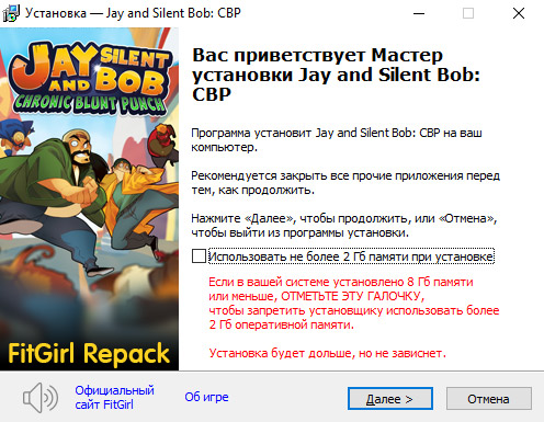 Jay and Silent Bob: Chronic Blunt Punch Дата выпуска: 20 апреля 2026 Жанр: Arcade, Beat 'em up (Brawler), Side, 2D Разработчик: Interabang Entertainment Издательство: Atari, Digital Eclipse Движок: Unity Пользовательские оценки в Steam: 59% обзоров пользователей - положительные (44 рецензии) Язык интерфейса: Английский, Французский, Итальянский, Немецкий, Японский, Испанский - Латинская Америка Язык озвучки: Английский Тип издания: Repack Лекарство: вшито (TENOKE) Системные требования: ОС: Windows 10 x64 Процессор: Intel Core i3-540 или AMD FX-4350 и лучше Память: 8 Гб Видео: NVIDIA GeForce GT 640, 4 Гб или AMD Radeon HD 5750, 1 Гб или лучше DirectX: 11 Место на диске: 18.2 Гб (до 29.9 Гб на время установки репака)