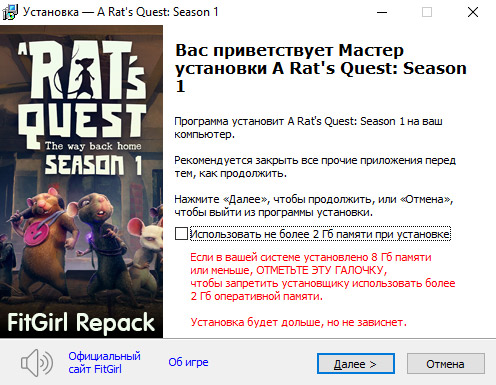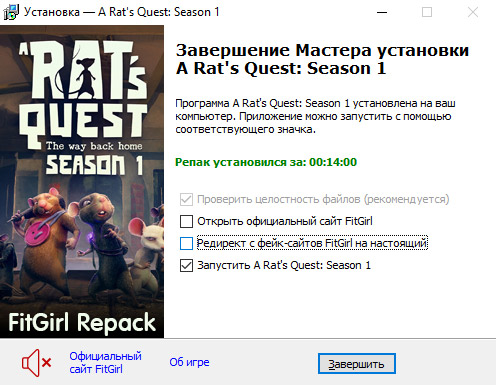 - Репак основан на ISO-образе A.Rats.Quest.The.Way.Back.Home.Season.1-RUNE: rune-a.rats.quest.the.way.back.home.season.1.iso (30,690,607,104 байта)