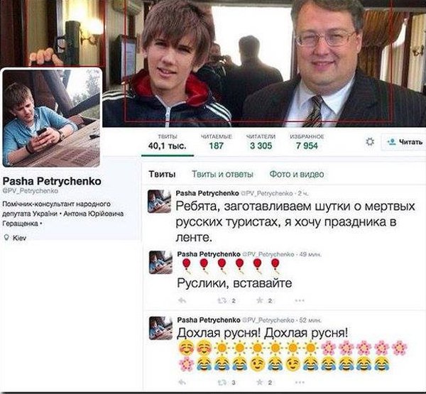 Господи, что вы несёте? Прекрати уже гуглить где же там Шария поймали на чём-то и не проверяя кидать сюда. В тексте рассматривается одна (одна, Карл!) отфотошопленная фотка, которая показывается несколько секунд не как доказательство чего-то а просто как скрин твиттера кретина, про которого говорит Шарий. Того, что слева. Т.е. отфотошопил фотку сам хозяин твиттера, вот этот скрин. Шарий этого не делал и показывал её не как доказательство того, что этот кретин близок к Геращенко. С чего вообще там взяли про "советника Геращенко" если в видео об этом ни слова? Зачем они опровергают то, чего Шарий не утверждал? Видео вообще не об этом а о толпе скотов, радовавшихся разбившемуся самолёту и погибшим людям. Надеюсь это не слишком сложные выкладки и ты поймёшь насколько глупо выглядят эти "доказательства" непонятно чего. И перестань, пожалуйста, кидать сюда эту ересь если не потрудился хотя бы подумать насколько она глупа и безыдейна.
