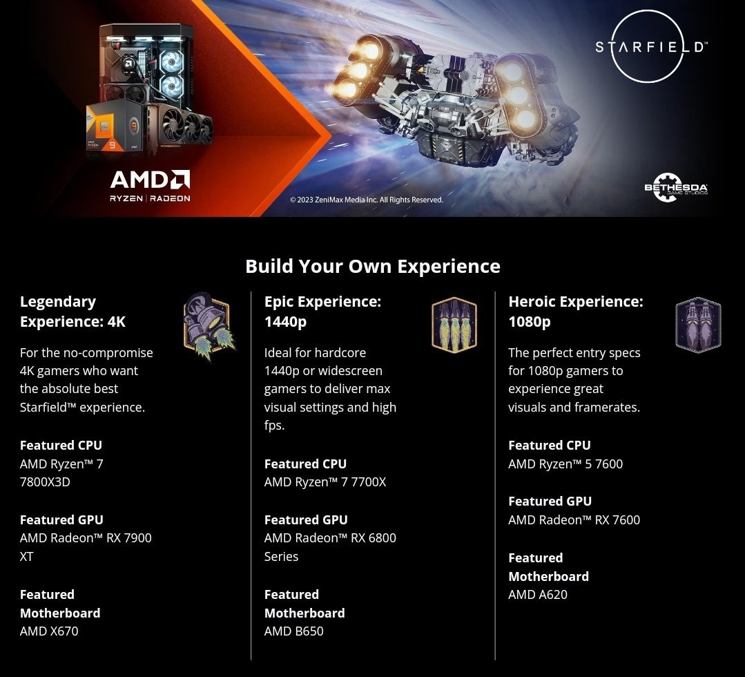Компания AMD опубликовала расширенные системные требования Starfield, где указала комплектующие, необходимые для запуска RPG в разрешениях 1080p, 1440p и 4K.