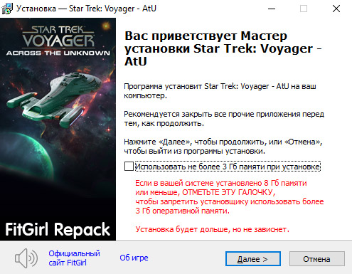 - Репак основан на ISO-образе Star.Trek.Voyager.Across.the.Unknown-RUNE: rune-star.trek.voyager.across.the.unknown.iso (8,904,015,872 байта)