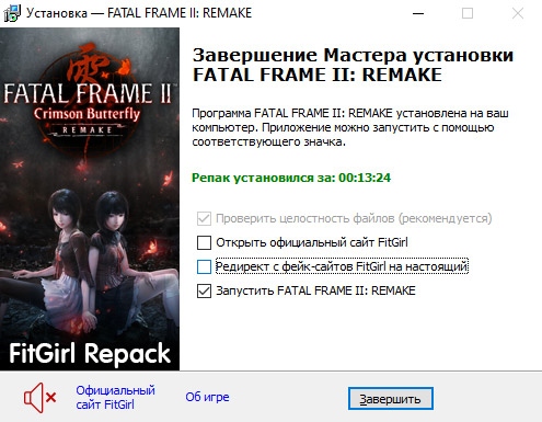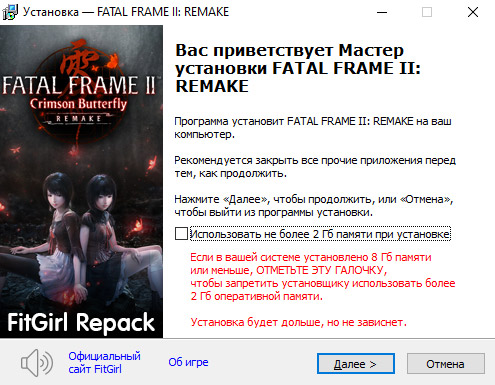 - Репак основан на ISO-образе FATAL.FRAME.II.Crimson.Butterfly.REMAKE-RUNE: rune-fatal.frame.ii.crimson.butterfly.remake.iso (33,451,671,552 байта)