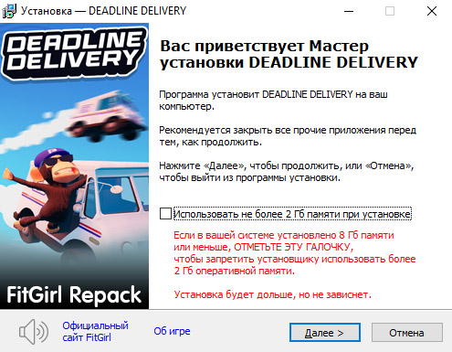 DEADLINE DELIVERY v0.973 + Бонусный саундтрек Дата выпуска: 16 марта 2026 Жанр: Arcade, Physics-based, Third-person, 3D Разработчик: Good1 Studios Издательство: Good1 Studios Движок: Unreal Engine 4 Пользовательские оценки в Steam: 85% обзоров пользователей - положительные (100 рецензий) Язык интерфейса: Русский, Английский, Французский, Немецкий, Испанский - Испания, Японский, Корейский, Португальский - Бразилия, Упрощённый Китайский, Испанский - Латинская Америка Язык озвучки: нет Тип издания: Repack Лекарство: вшито (TENOKE) Системные требования: ОС: Windows 10 x64 и выше Процессор: Intel Core i5-2400, AMD FX-4100 и лучше Память: 4 Гб Видео: NVIDIA GeForce GTX 780 Ti или AMD Radeon R9 290X или лучше DirectX: 11 Место на диске: 2.6 Гб