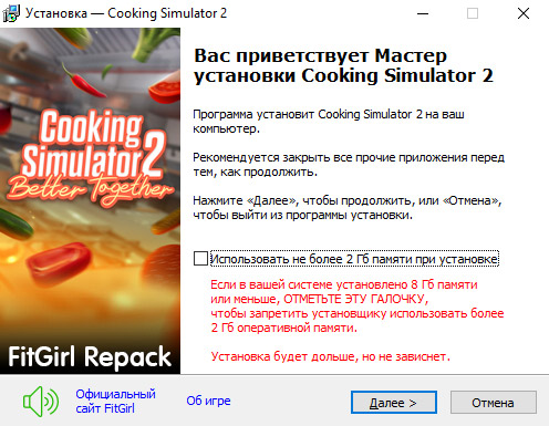 - Репак основан на ISO-образе Cooking.Simulator.2.Better.Together-TENOKE: tenoke-cooking.simulator.2.better.together.iso (10,099,275,776 байт)